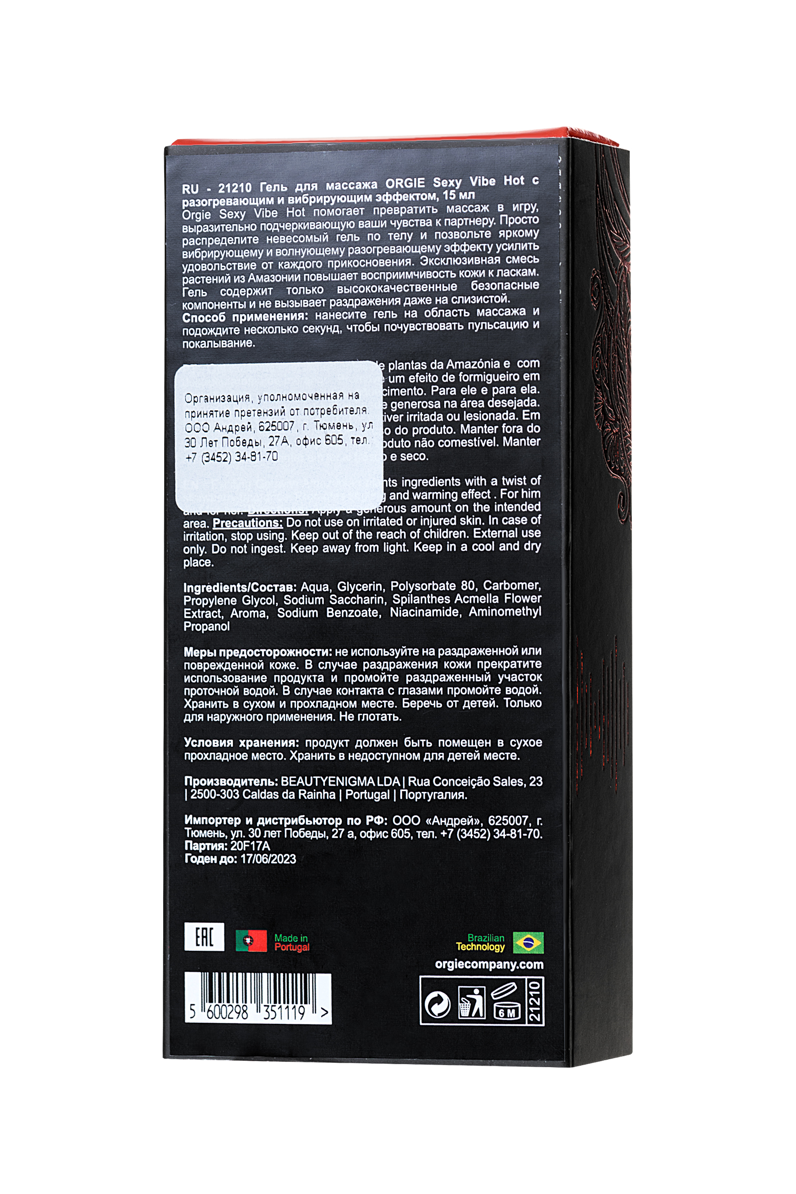 Орджи Sexy Vibe Intense Orgasm помогает превратить массаж в игру, выразительно подчеркивающую ваши чувства к партнеру. Просто распределите невесомый гель по телу и позвольте яркому вибрирующему и волнующему разогревающему эффекту усилить удовольствие от каждого прикосновения. Эксклюзивная смесь растений из Амазонии повышает восприимчивость кожи к ласкам. Гель содержит только высококачественные безопасные компоненты и не вызывает раздражения даже на слизистой. Способ применения: нанесите гель на область массажа и подождите несколько секунд, чтобы почувствовать пульсацию и покалывание.