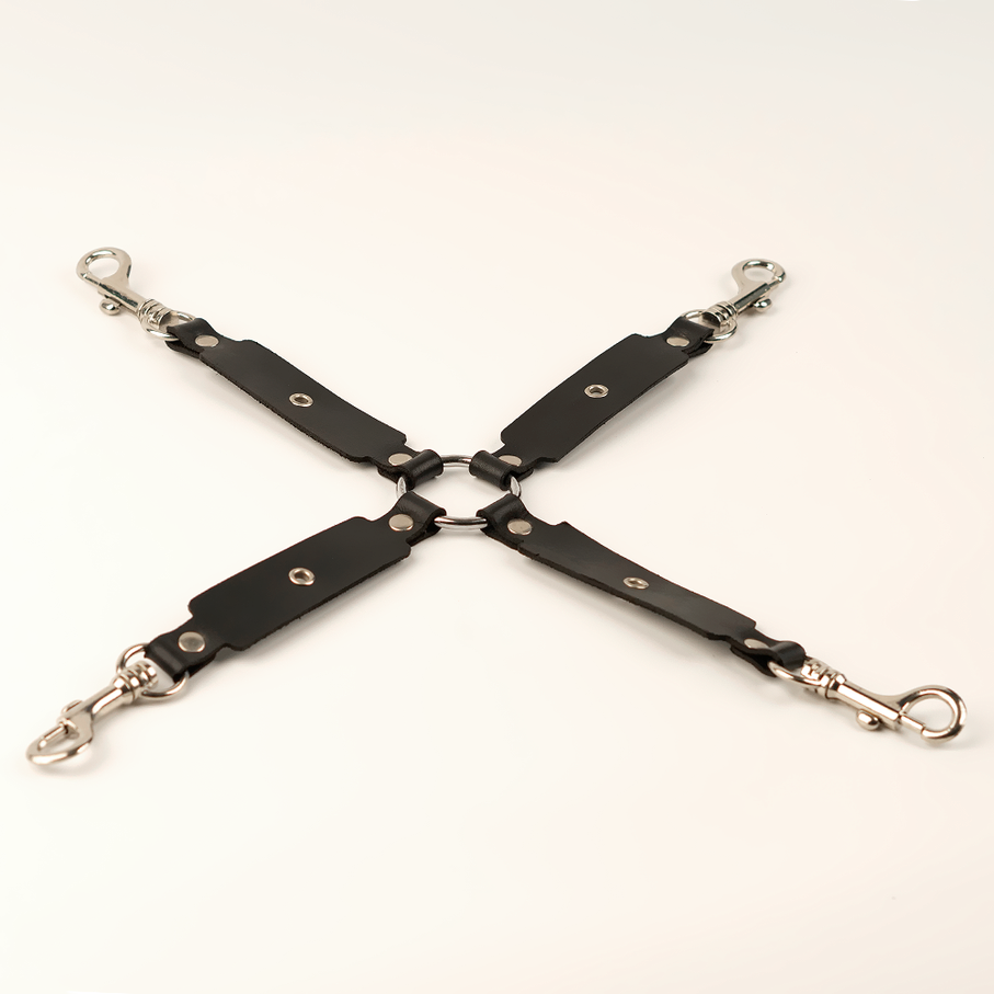 Этот 4-сторонний бондажный переходник с кожаными ремешками Крэйзи хенд-мейд предназначен для скрепления фиксирующих приспособлений между собой. Это могут быть, к примеру, оковы и наручники. Такой универсальный переходник помогаетне ставить рамки своему воображению и желанию экспериментировать.