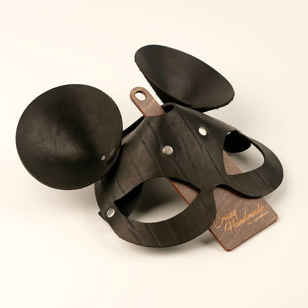 Маска с ушками мышки Крэйзи хенд-мейд, изготовлена из натуральной кожи и украшена никелированной фурнитурой. Размер универсальный.