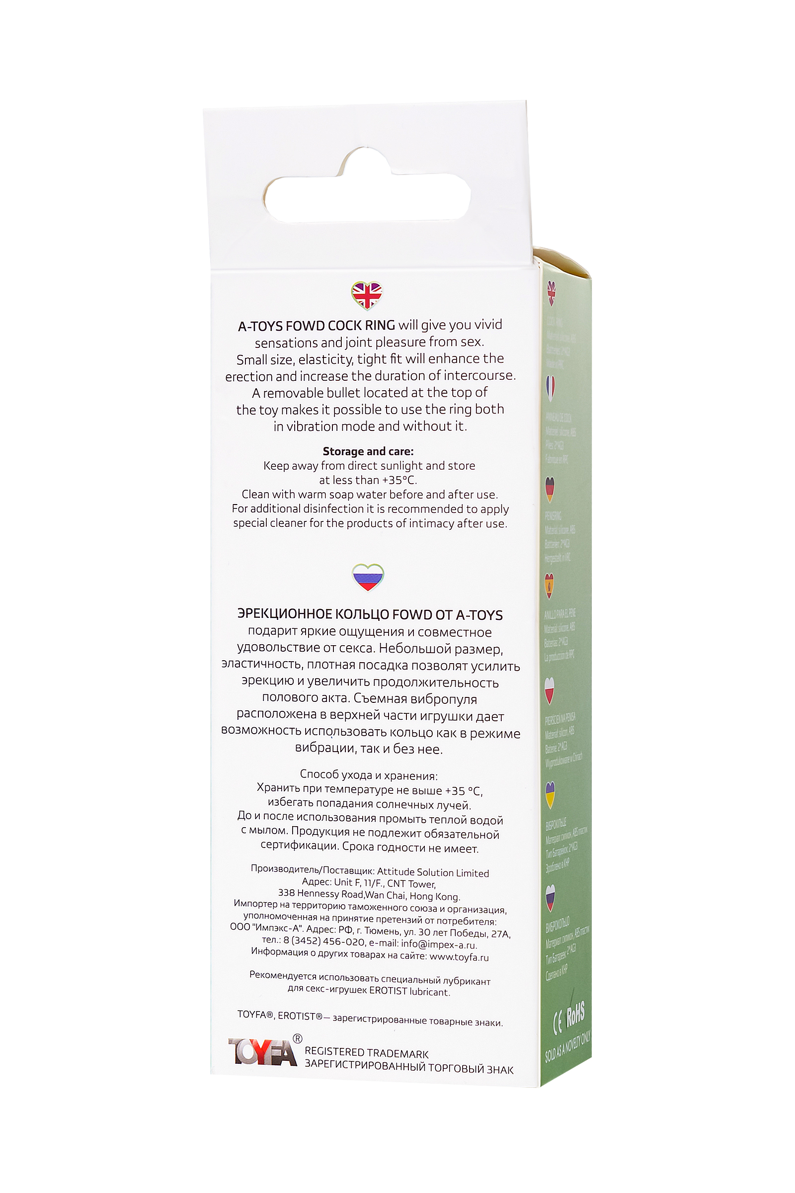 Эрекционное кольцо Fowd от Тойфа А-Тойс подарит яркие ощущения и совместное удовольствие от секса. Небольшой размер, эластичность, плотная посадка позволят усилить эрекцию и увеличить продолжительность полового акта. Съемная вибропуля расположена в верхней части игрушки дает возможность использовать кольцо как в режиме вибрации, так и без нее. Рекомендуем использовать до и после применения - дезинфицирующее средство для игрушки и для более ярких оргазмов использовать возбуждающую смазку на водной основе. Хранить при температуре не выше 35 градусов, избегать попадания прямых солнечных лучей.